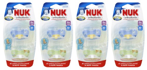 NUK pacifiers do more than just soothe, they encourage healthy oral development and support strong feeding skills. Orthodontic design gently exercises tongue, palate and jaw and promotes proper teeth alignment. NUK Air System allows nipple to self adjust for proper fit. Grooves in the pacifier shield allow air to circulate helping to prevent skin irritation. Size 1 pacifiers are recommended for infants up to 6 months old.
